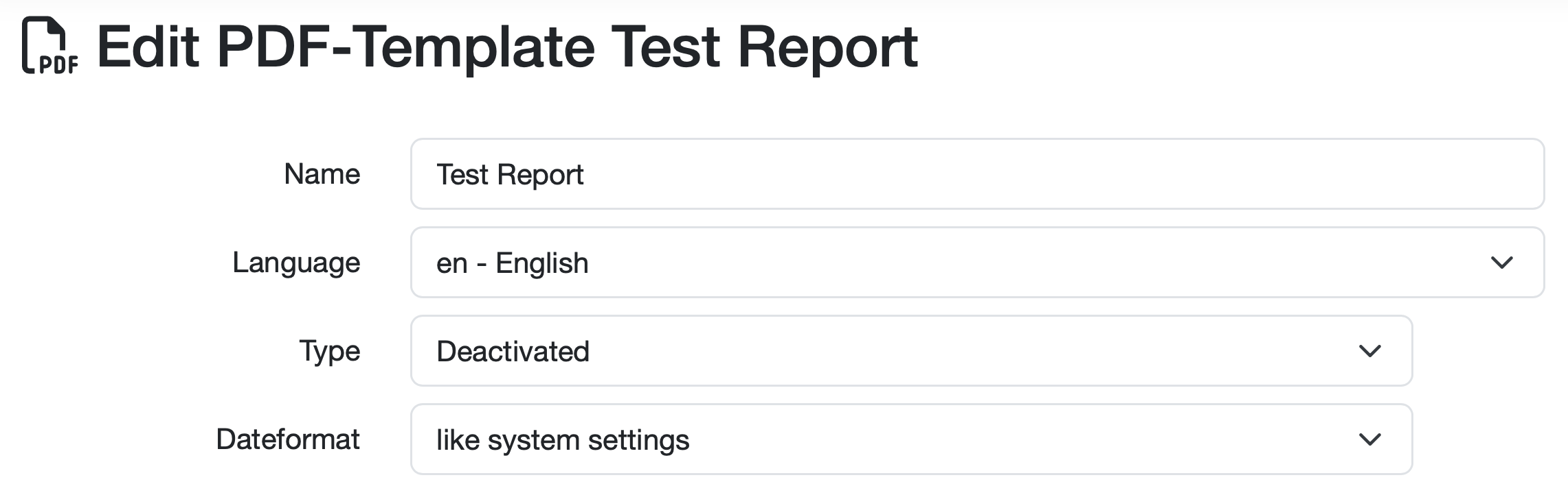 Now you can set the basic settings for your document. Give the PDF template a unique name, as this will be displayed when creating the document (e.g., test report).