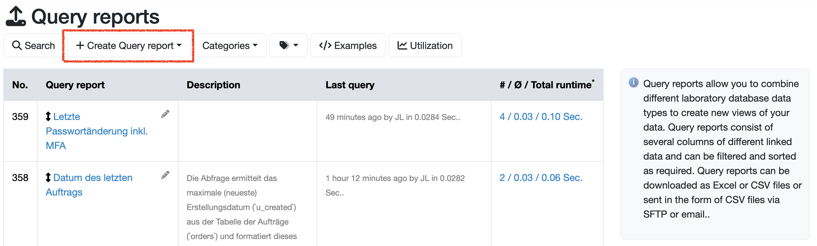 Enter your SQL query in the field for the SQL query. You can use the examples as a guide or use the web search to find the appropriate SQL command for your query report. You can find some SQL basics in the following guide: SQL Basics