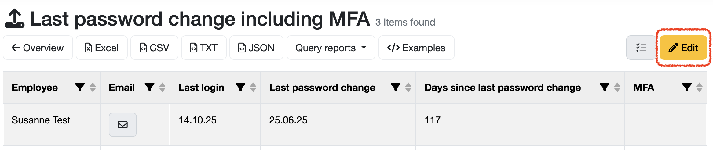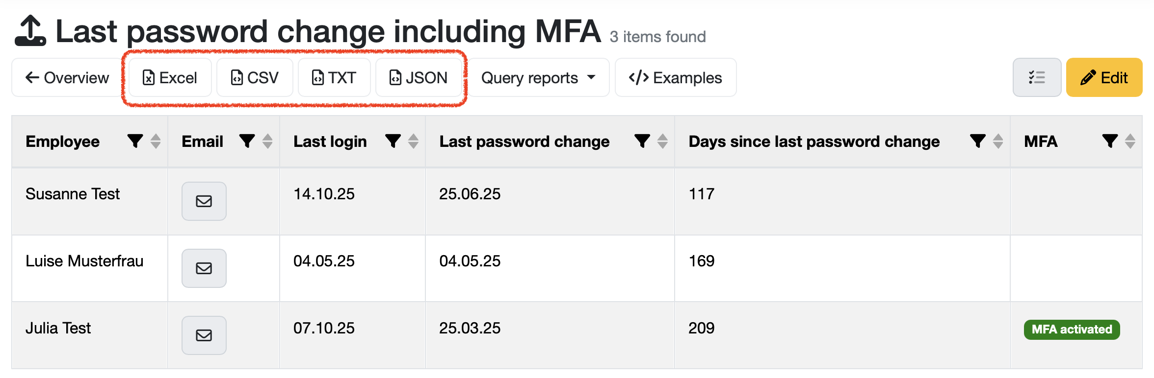 By default, you can export the table for your query report as Excel, CSV, TXT, or (flat) JSON.