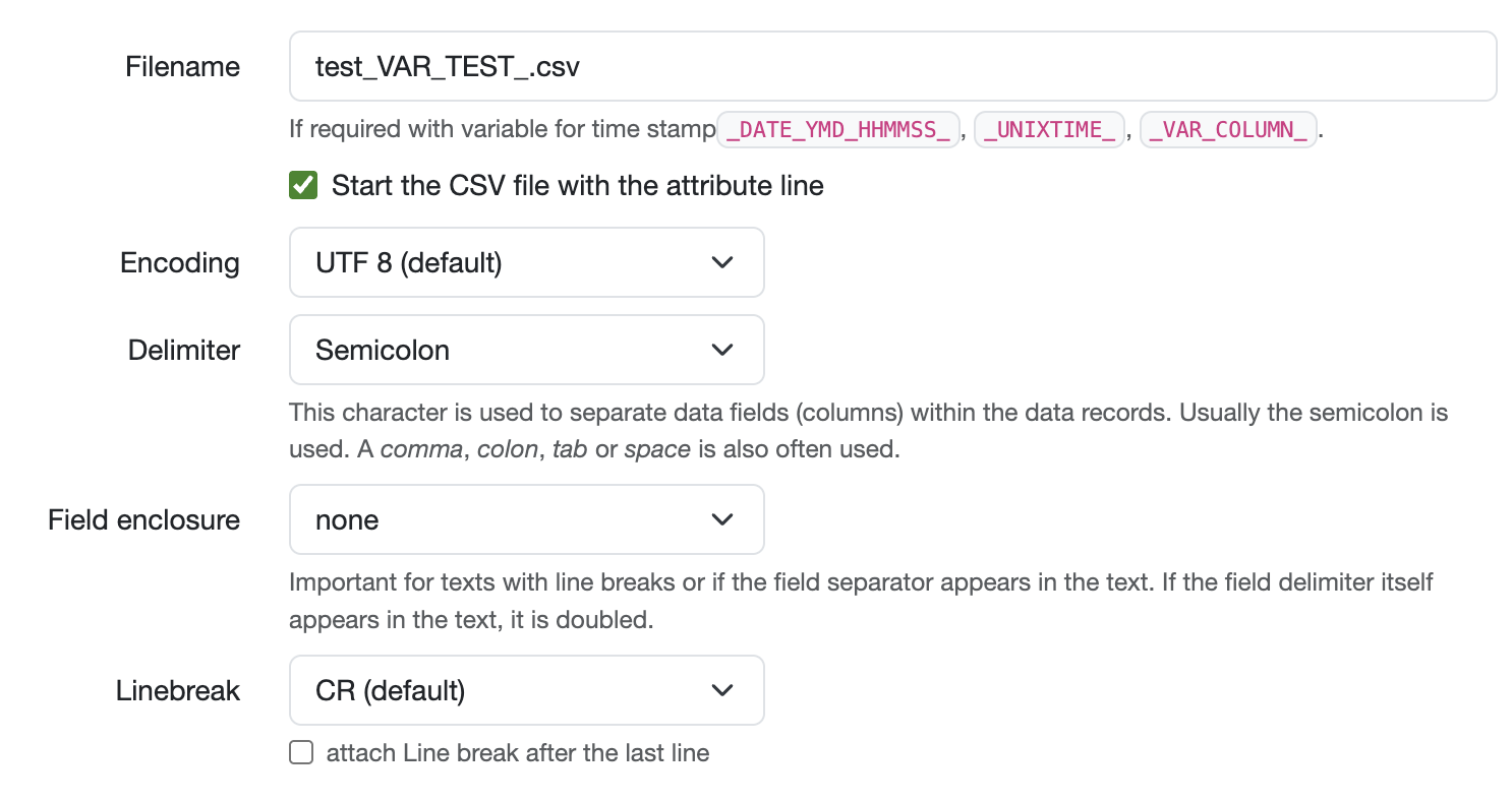 _DATE_YMD_HHMMSS_ for timestamp_UNIXTIME_ for Unix time _VAR_COLUMN_NAME_ for column contentsThe file extension .xml also allows you to provide the CSV structure as an Excel file.