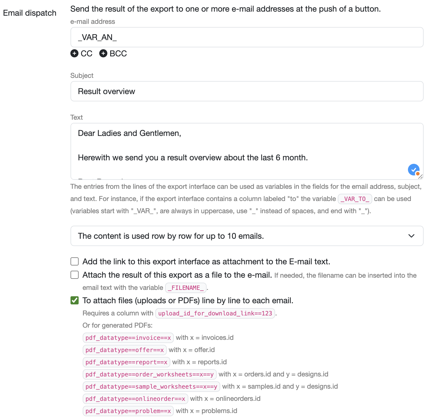 The recipient address can be stored permanently or filled with a dynamic variable, e.g., VAR_AN. The variable is filled from the columns of the SQL report data—for this, the SQL report must contain a column “To,” then the variable _VAR_AN_ is automatically replaced by the content of the column.