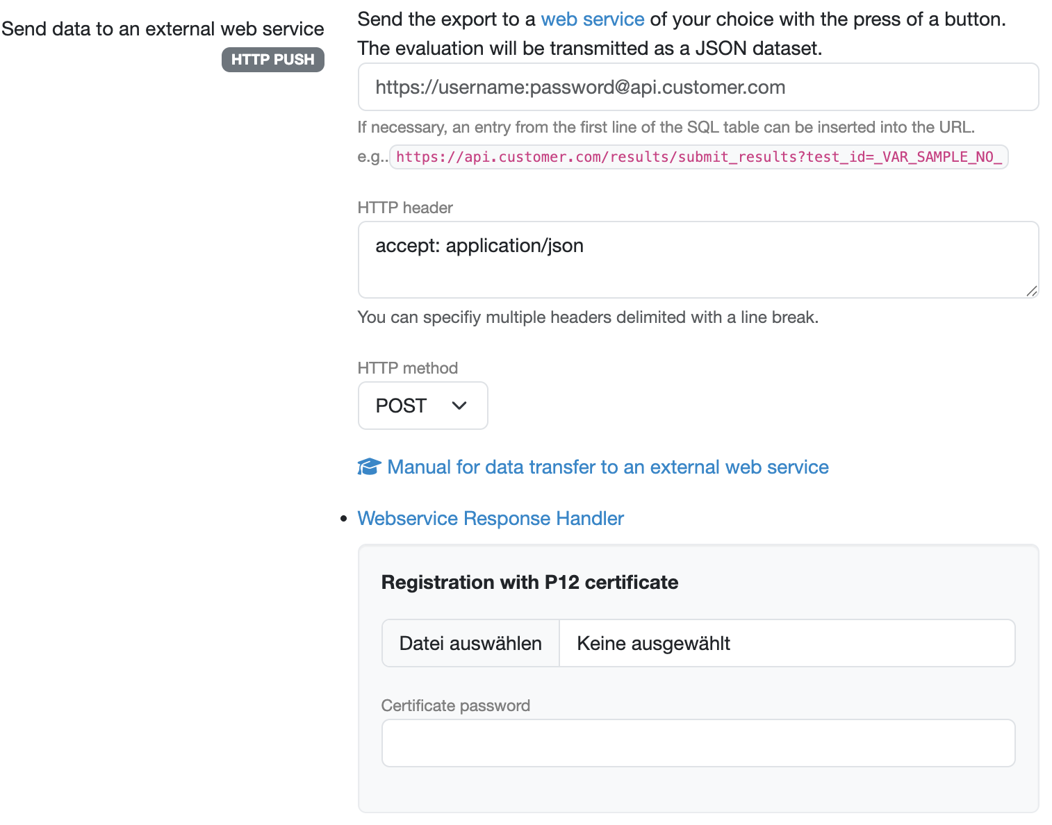 The export of files via HTTP PUSH can be activated by entering the target address, including username/password, in the field provided.