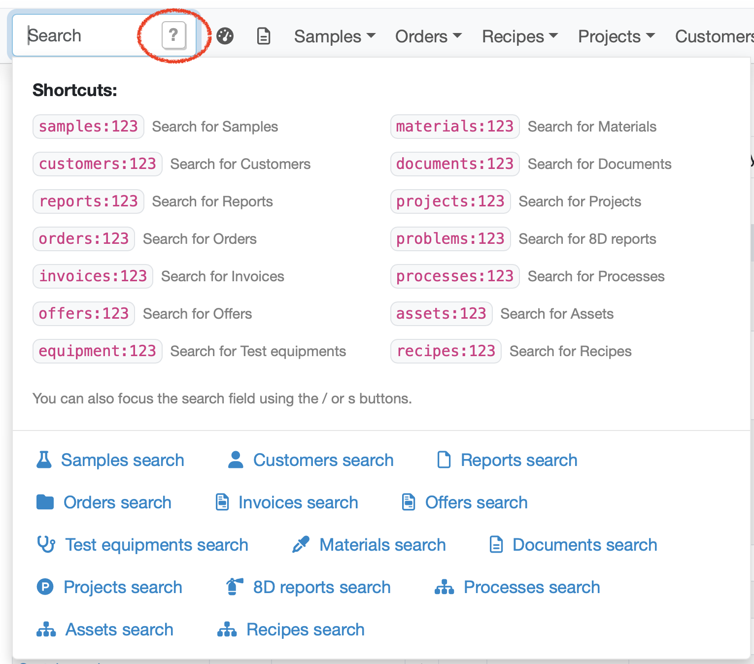 Search shortcut system: By entering special search shortcuts following the pattern Area:SearchTerm, you can search specifically for samples, customers and other data.