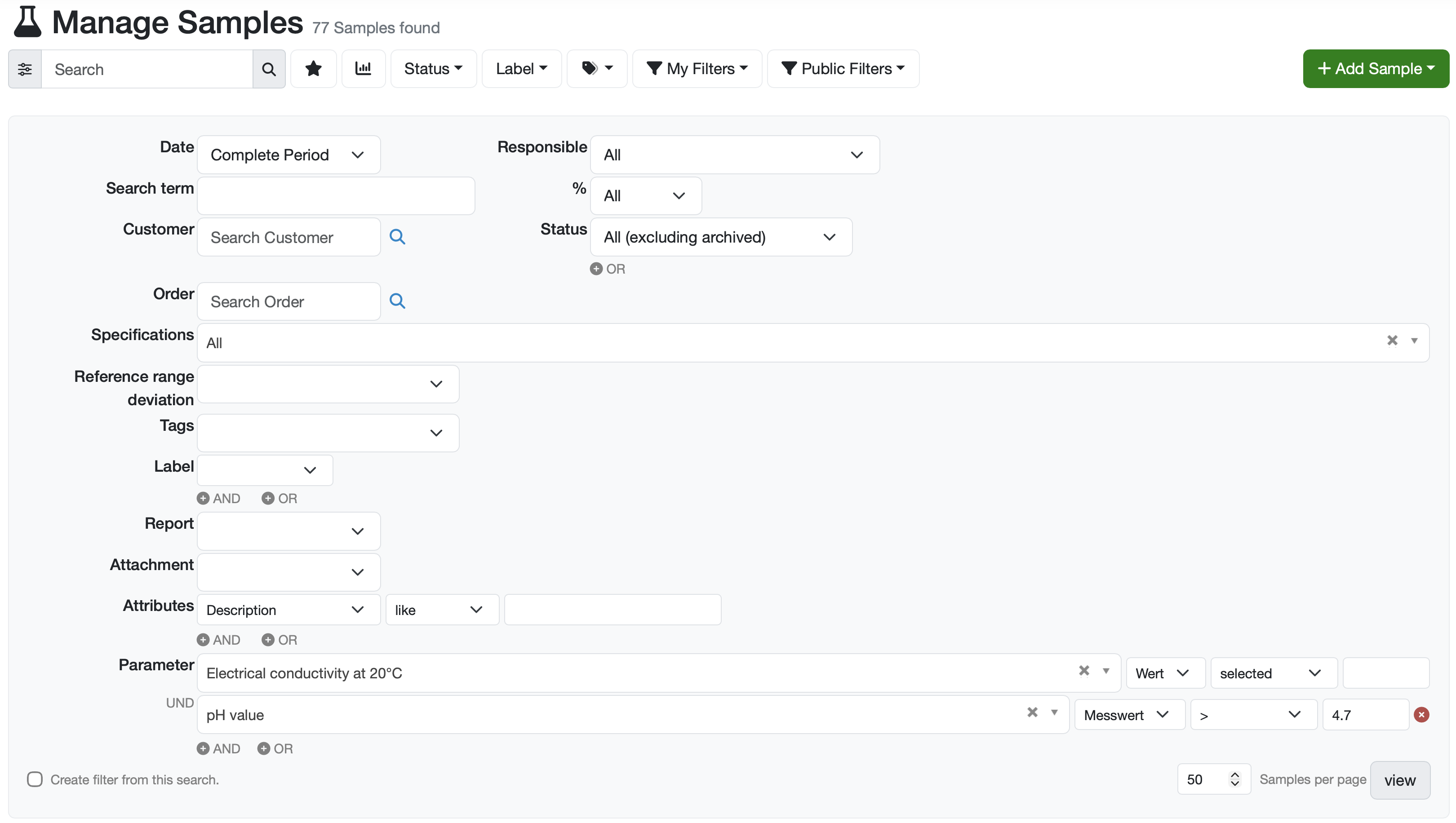For example, you can find all samples where the parameter Conductivity is selected and the pH value > 4.7.