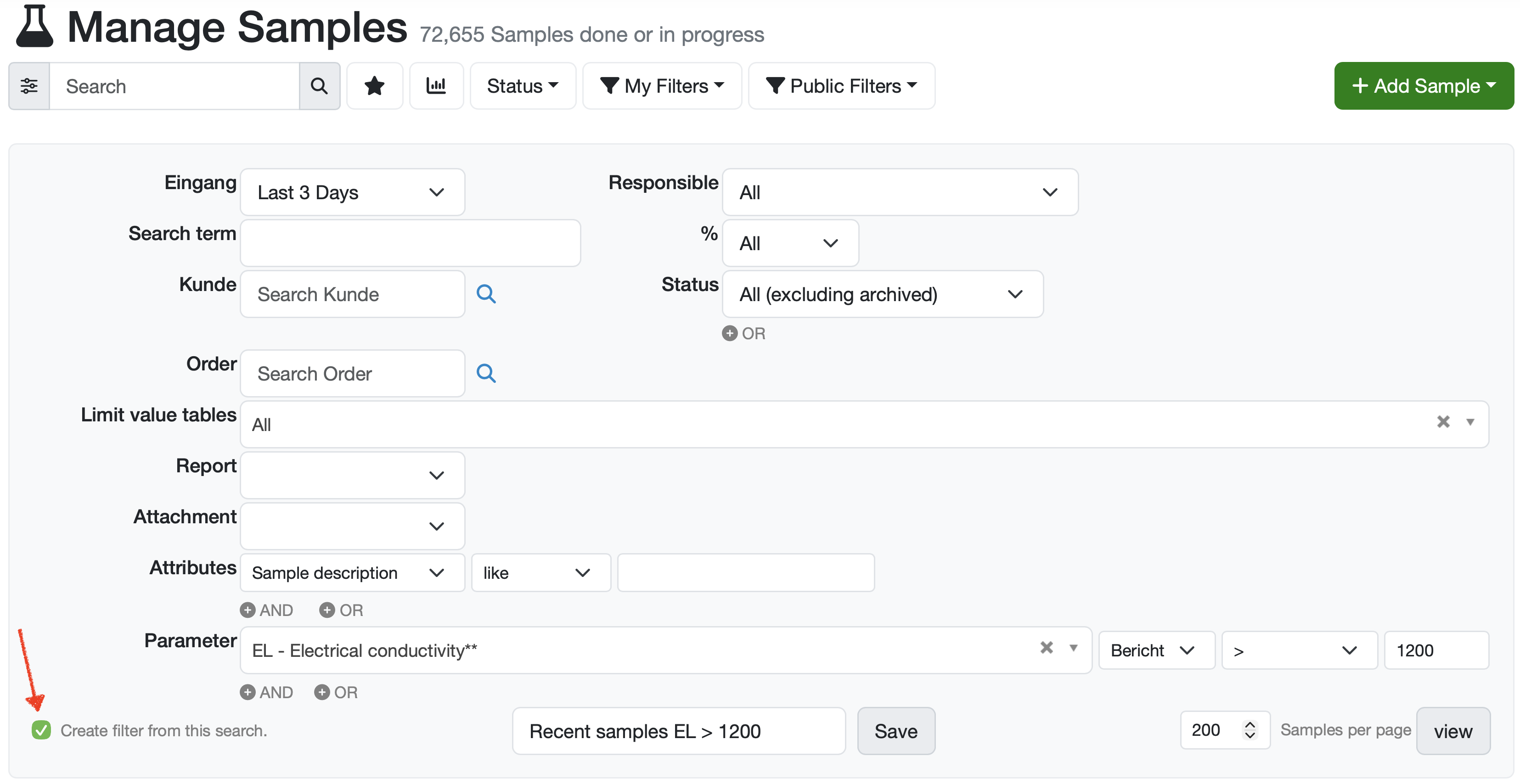 With the detailed search mask, you can filter samples based on specific criteria and combinations, e.g. by Date, Customer, Order, Responsibility, Status, Tags, Reports, Attachments or specific parameters.