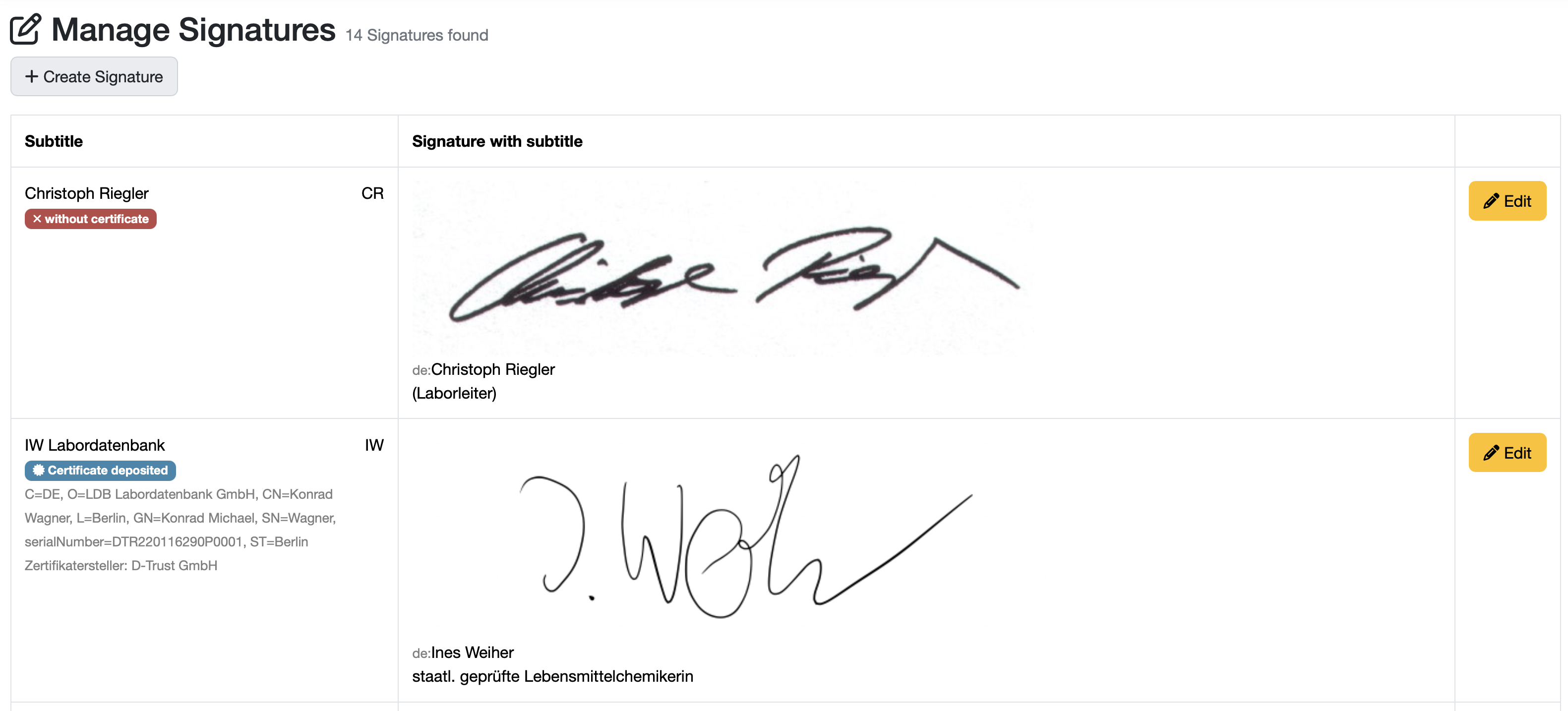 Each signature in the Labordatenbank has a name and is directly assigned to an account. The signature itself consists of an image that is not much larger than the signature. The captions are printed below the signature image and usually contain the person's name in plain text and, if applicable, their position.