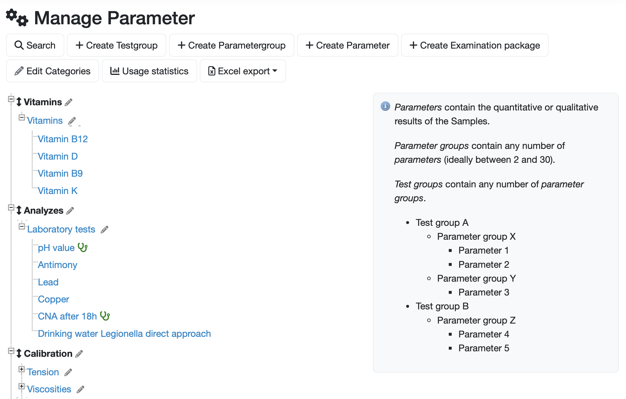 The parameter usage statistics provide an overview of the frequency of use of parameters and groups. They enable you to analyze trends and developments and identify frequently used parameters over different periods of time. They support you in operational analysis (which parameters are used how often?), strategic planning (how is the business developing?), resource optimization (where should capacities be focused?), and quality management (where do measurement repetitions occur?).
