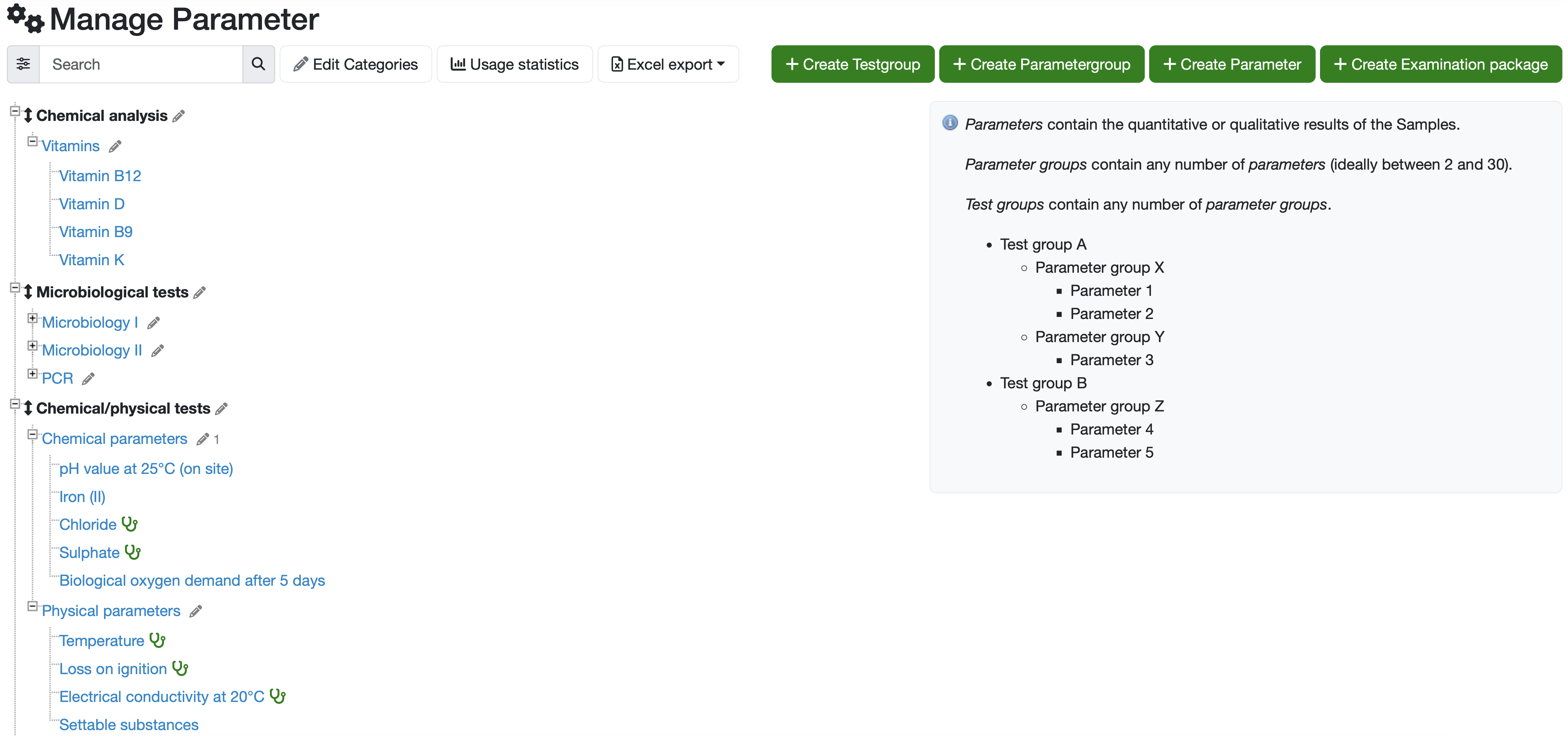 Use the green buttons in the top menu bar to add new test groups, parameter groups, parameters or test packages.