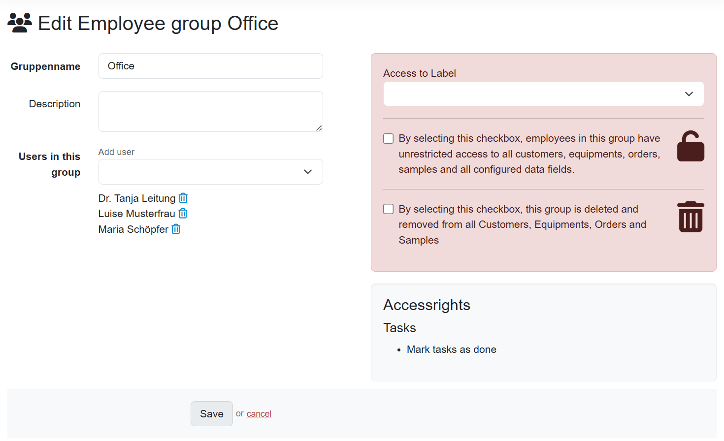 Group name: Enter the name under which the group will appear throughout the Labordatenbank.