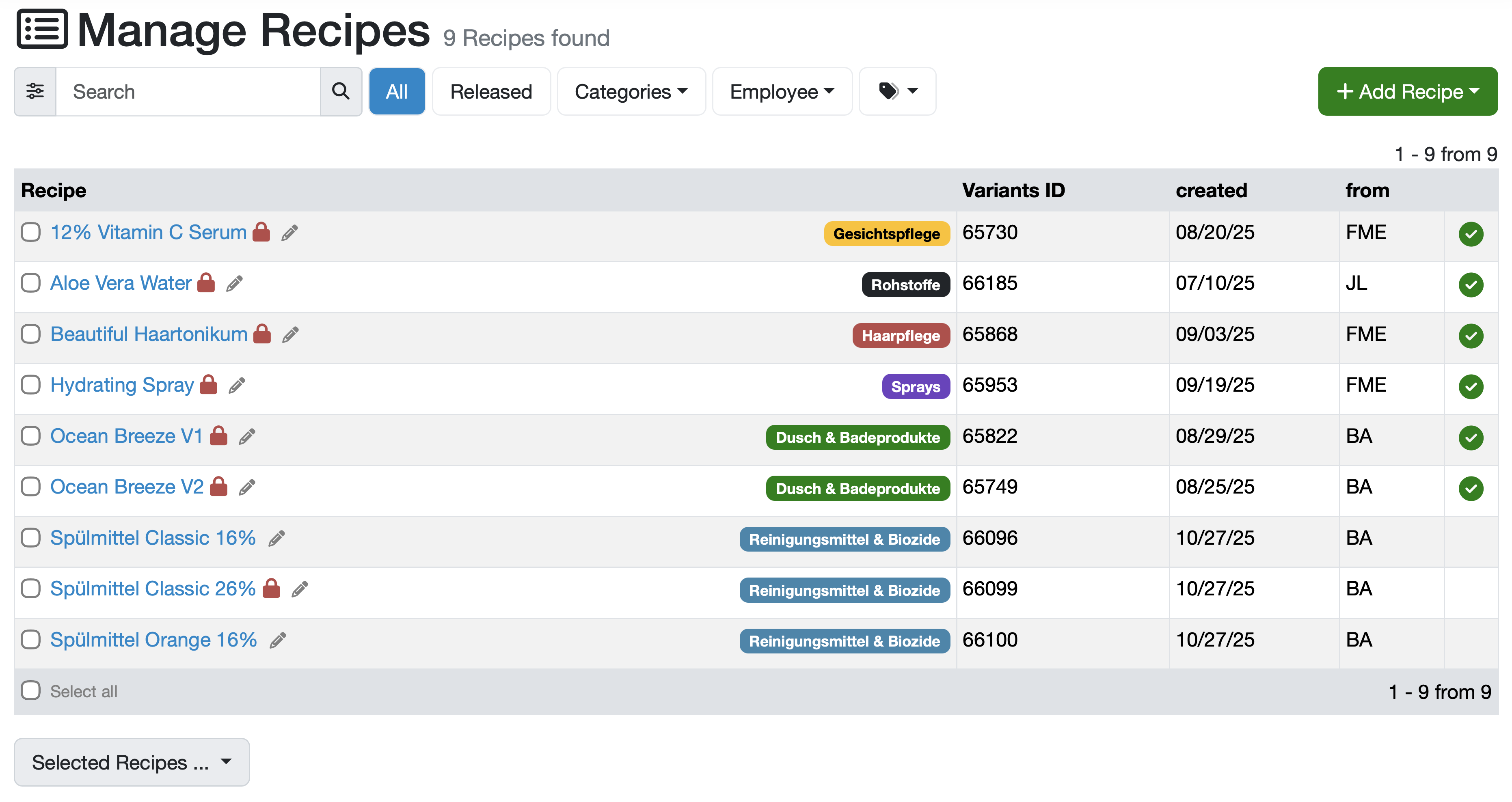 This guide describes the comprehensive management of recipes in the LDB, including navigation, filtering, creation, editing, approval, and batch processing.