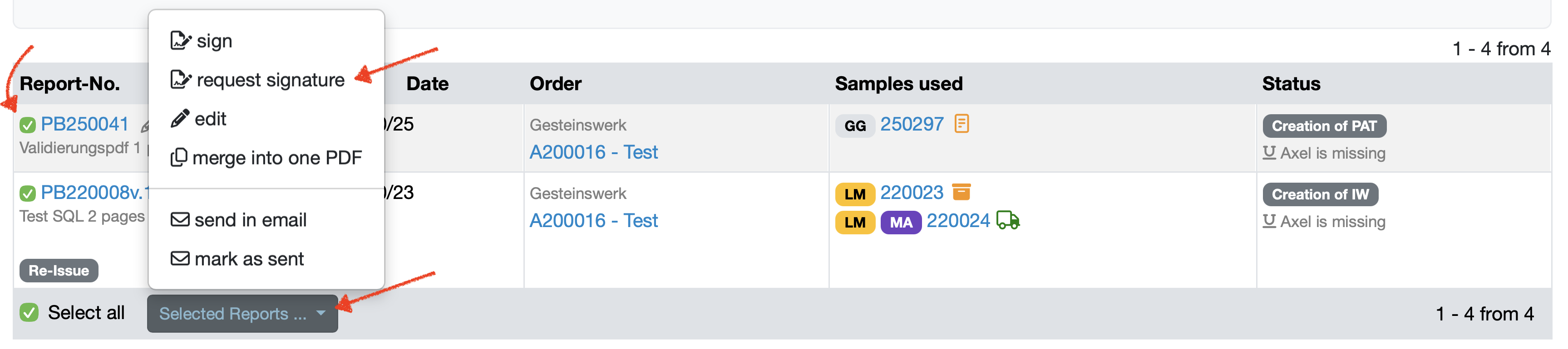 In the report overview, the reports for which a signature request has been sent now have the status Signature requested.