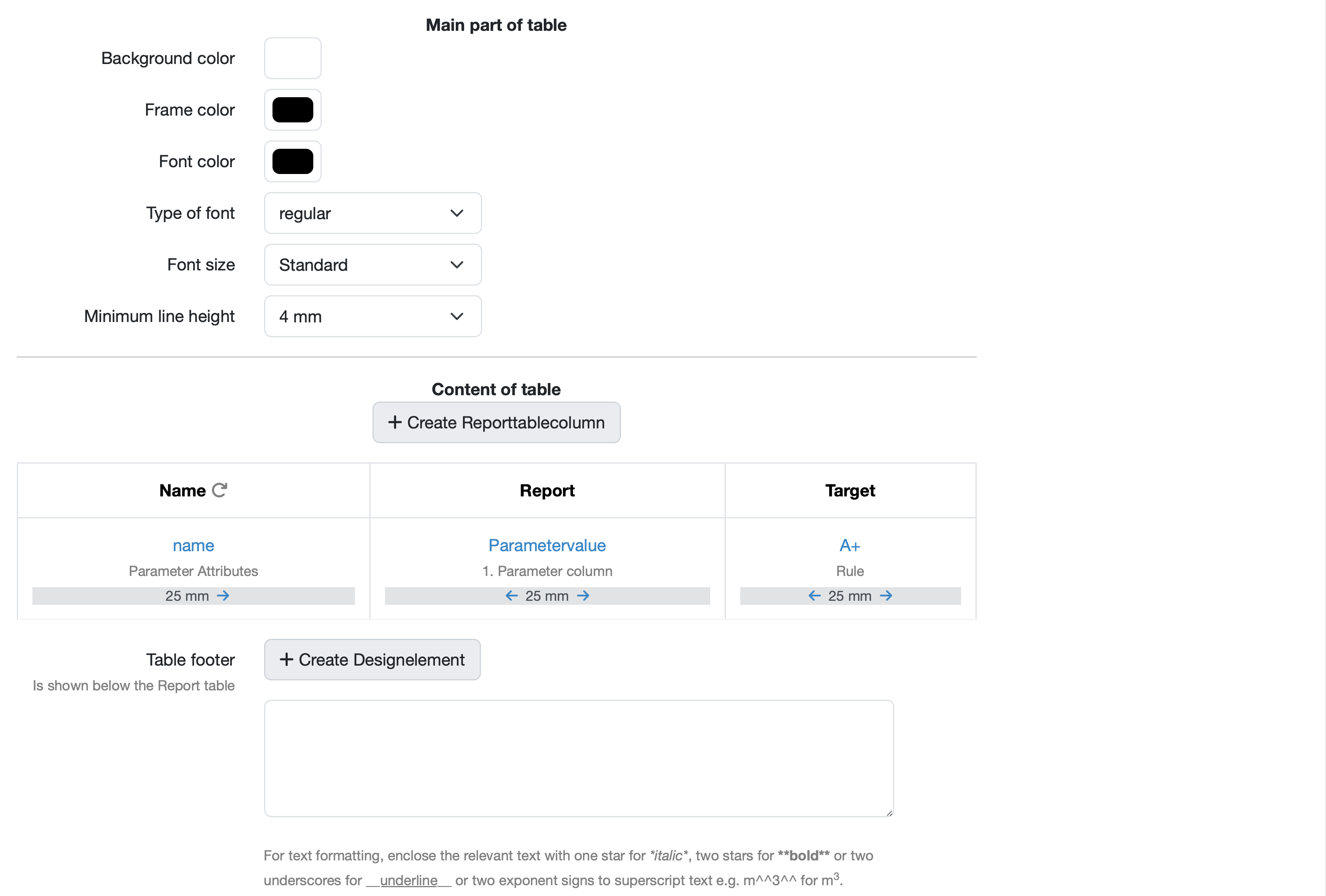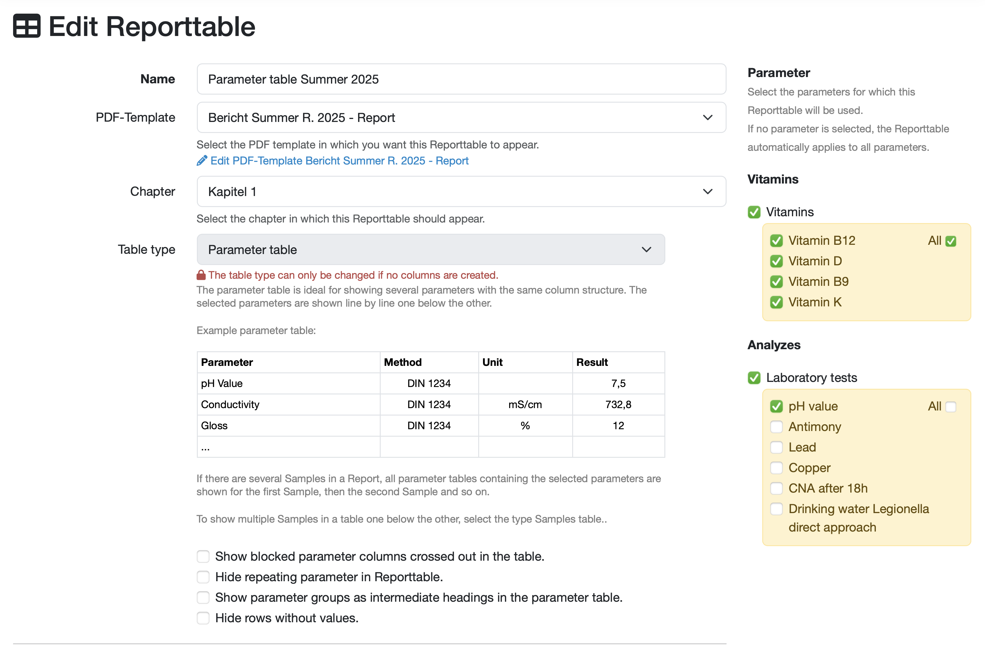 This comprehensive editing page allows you to fully configure report tables for PDF reports. Using the example of the “Summer 2025 parameter table,” all setting options for layout, content, and formatting are shown.