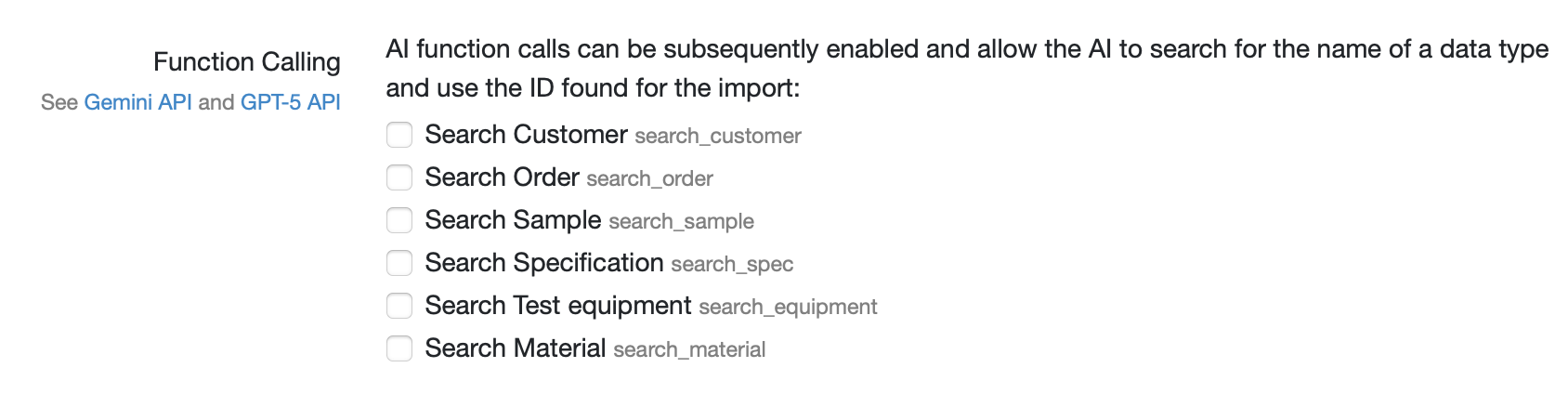Function Calling can optionally be activated for selected data types (opt-in) and enables making data required for import available for AI retrieval.