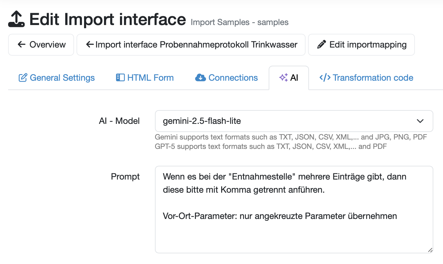 For using AI extensions with the import interfaces of the Laboratory Database, general AI usage must be activated in the Laboratory Database system settings. Subsequently, you will find a new tab in the settings of all import interfaces where you can configure AI usage for an import interface.