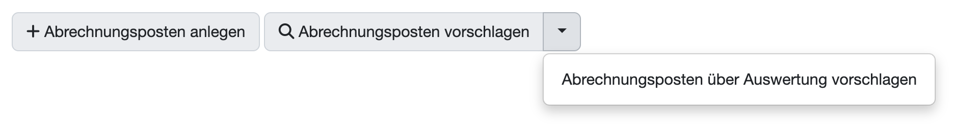 In the evaluation, the option “Suggest billing items” must be selected under “Appears in”. This causes this evaluation to appear in the orders in the billing area in a drop-down menu on the “Suggest billing items” button in a drop-down arrow. After selecting the evaluation, the billing items suggested by the evaluation appear and can be selected or deselected via checkboxes before being added to the order billing by clicking on “Add selected billing items”.