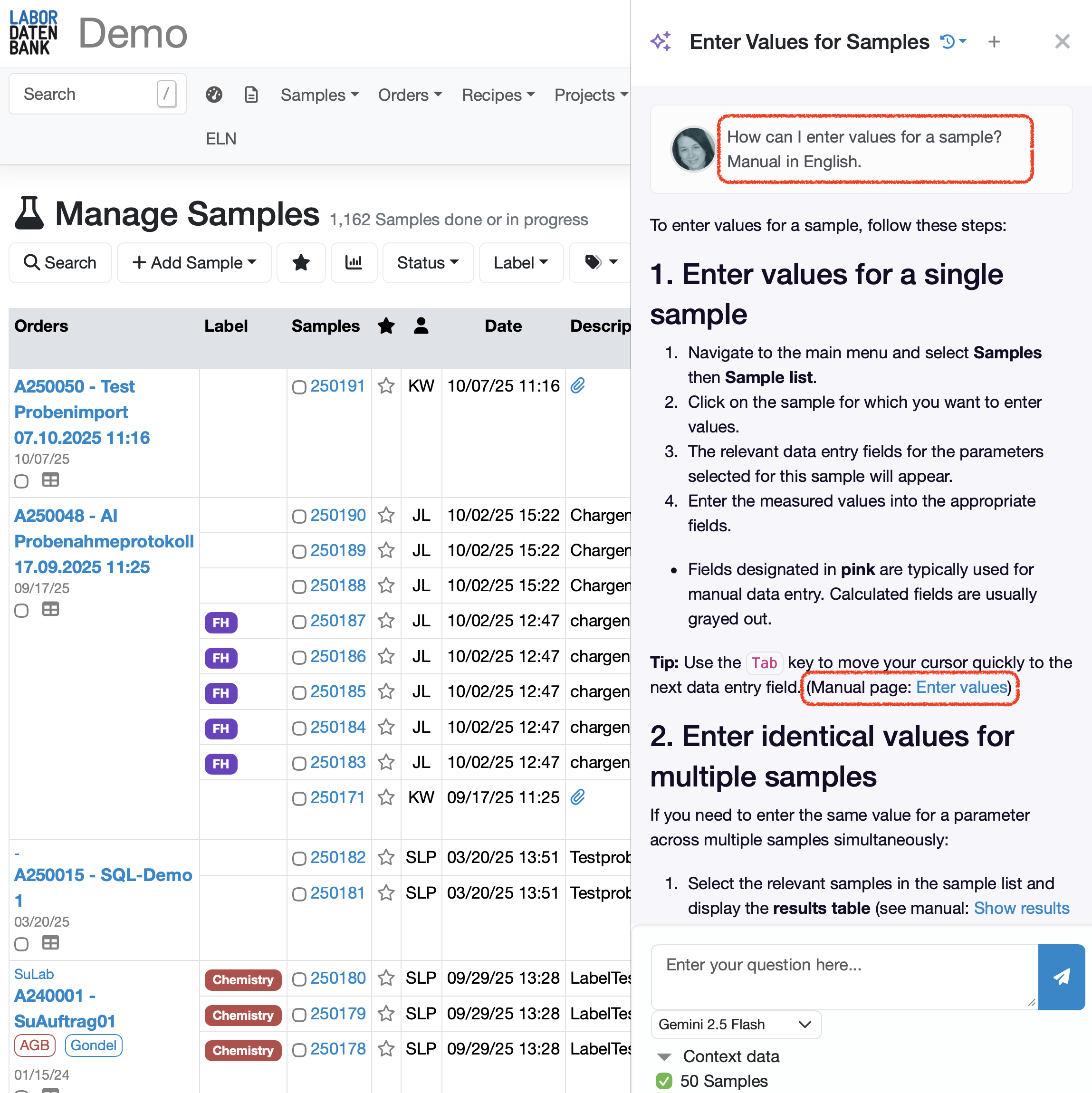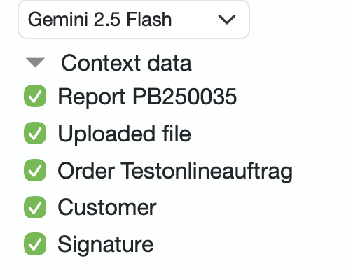 The AI Explorer automatically provides the appropriate context for each data record (sample, order, customer, test equipment, material, document, etc.) so that the AI can deliver relevant answers.