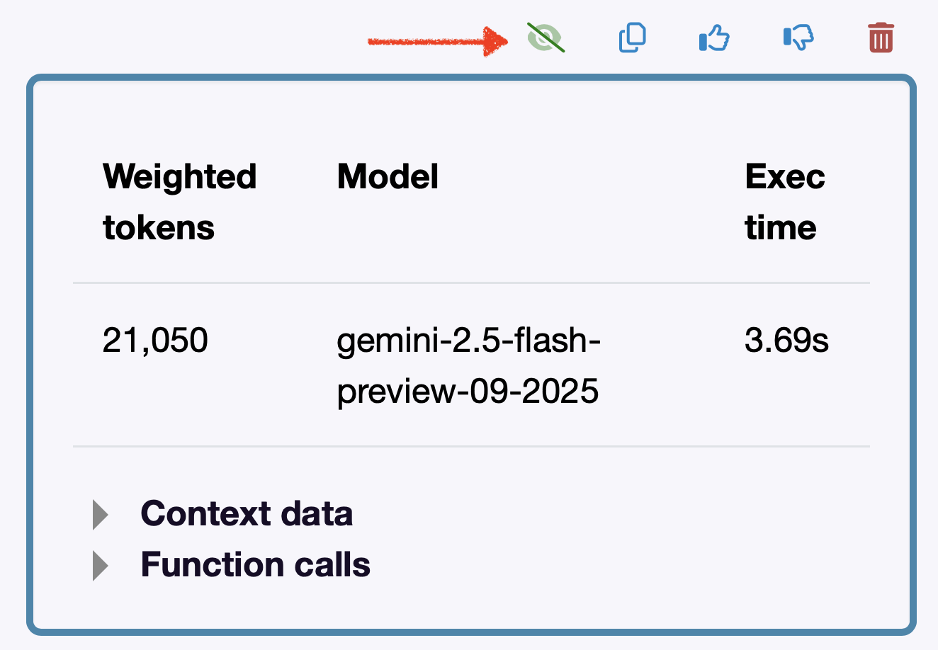 Show metadata (eye icon) - shows you information about the number of tokens used, the AI model used, and the processing time.