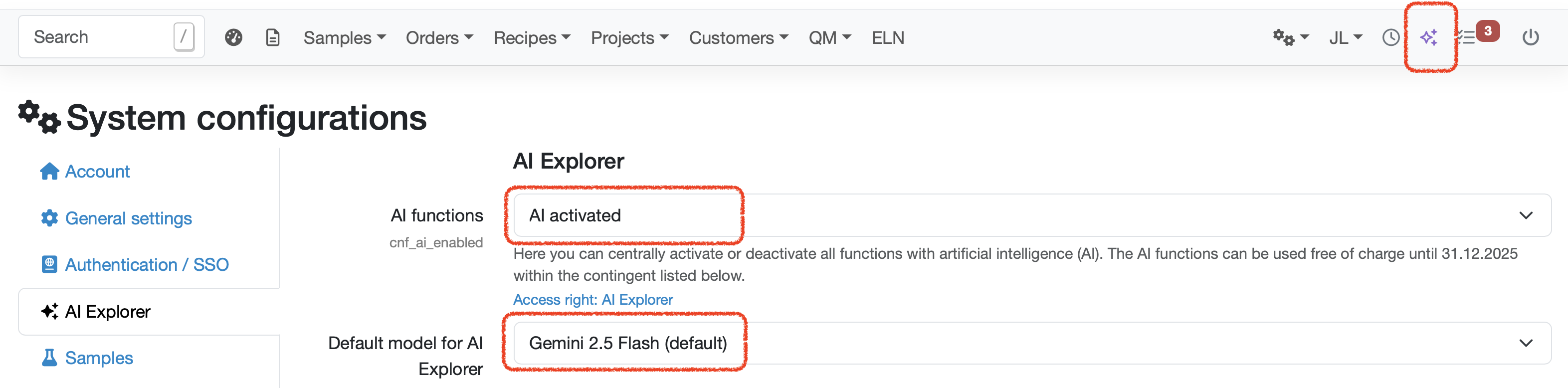 To enable or disable all AI functions centrally, go to: Navigation bar → Settings (gear icon) → System configurations → AI Explorer