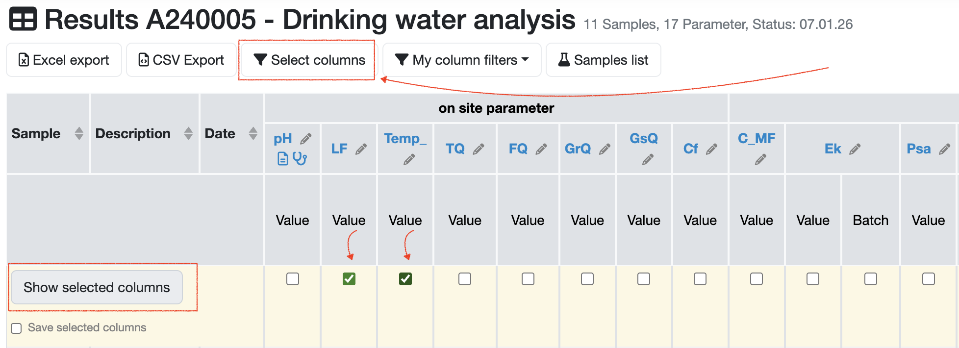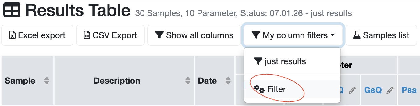 Navigate to the results table for the relevant sample(s). (see user's manual: Show results table)