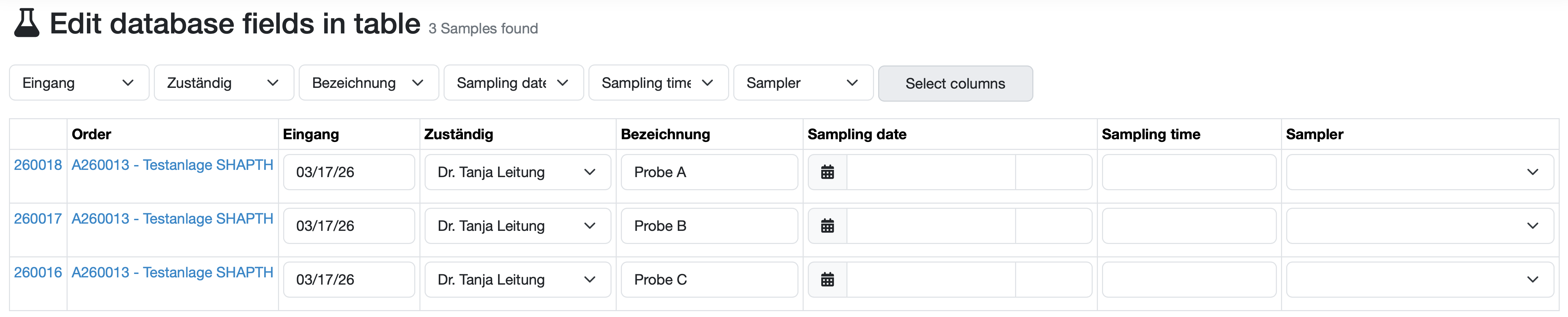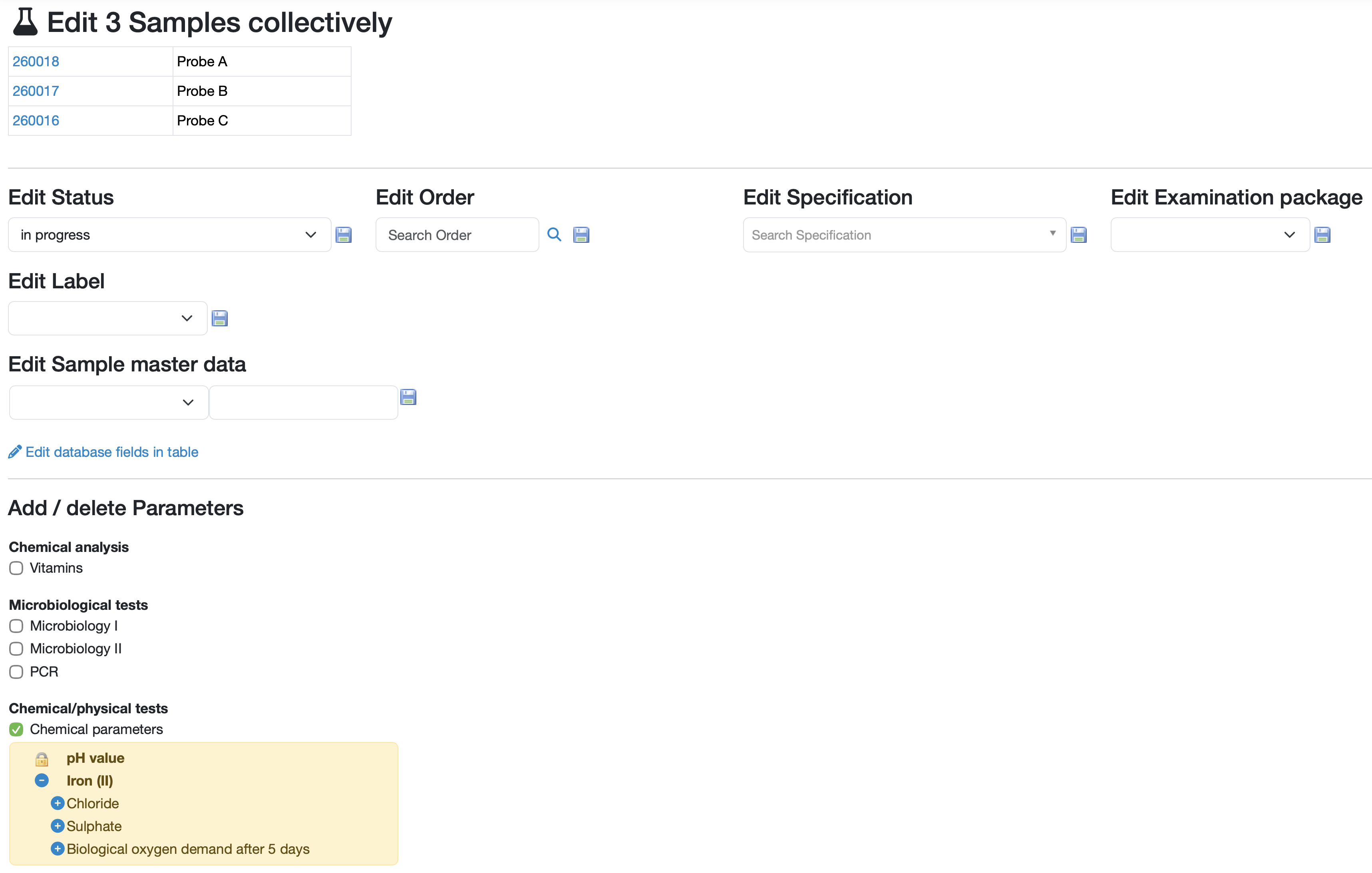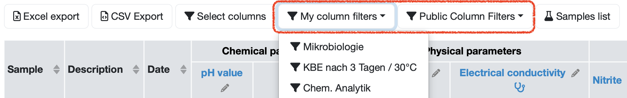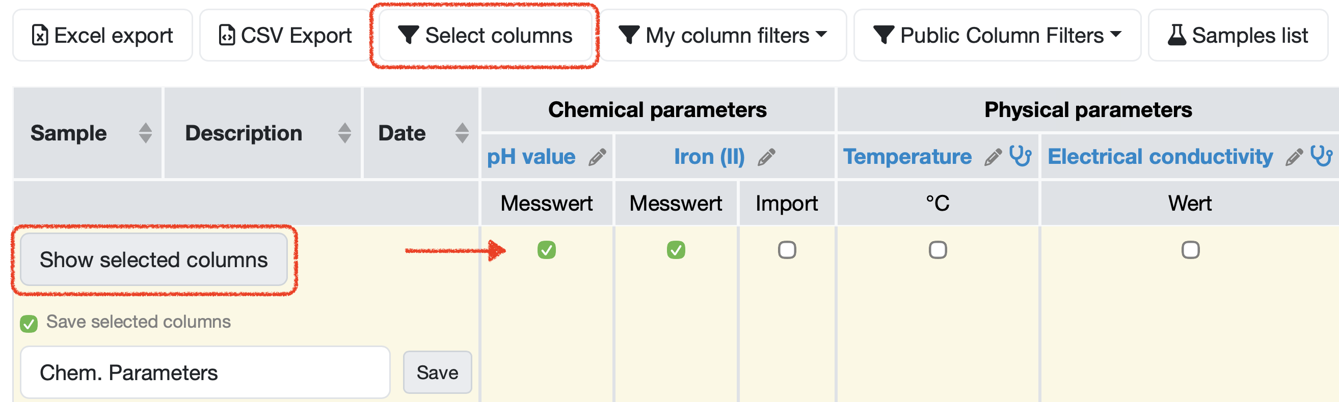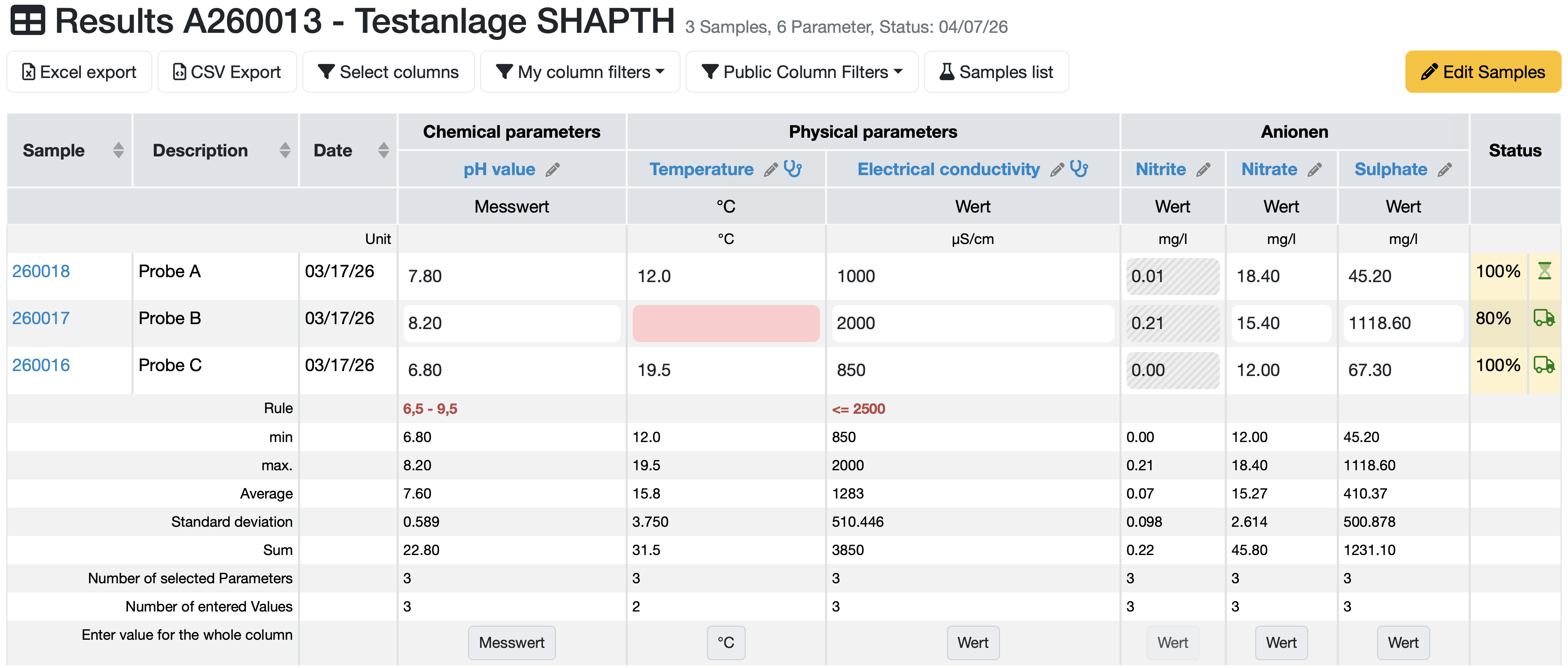| Parameter groups (e.g. Chemical parameters, Physical parameters, Anions) | Sample- and configuration-dependent column groups with the respective individual parameters, units and measured values. A pencil icon next to the parameter name allows direct editing of the parameter type (with appropriate permissions). |