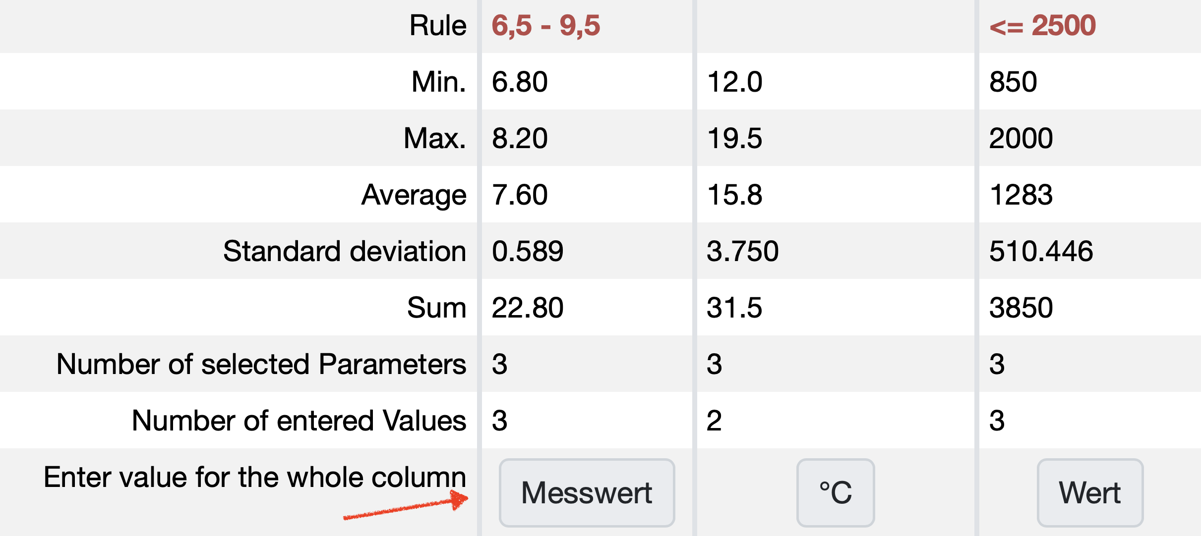 Below the sample data, the Results table automatically displays statistical key figures for each parameter: