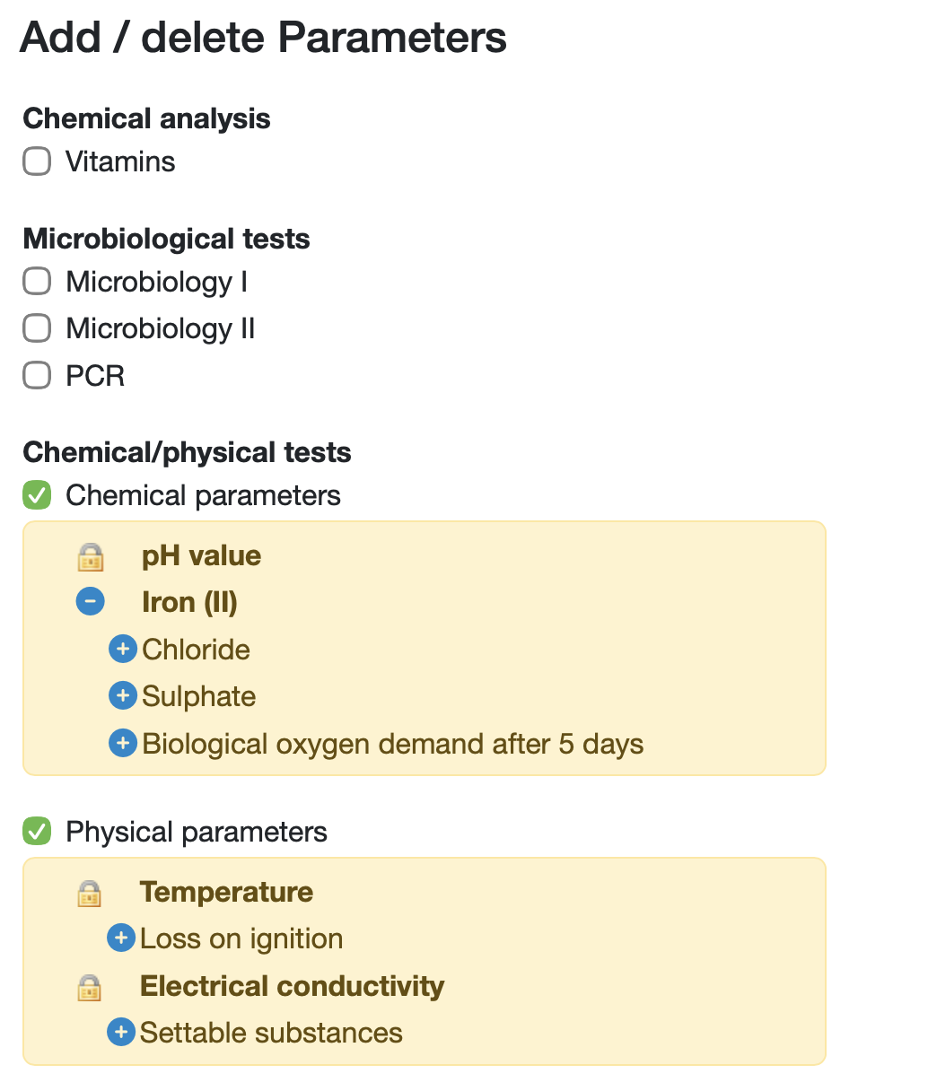 Note: Parameters with already entered measured values can no longer be removed. (Indicated by the lock icon.)