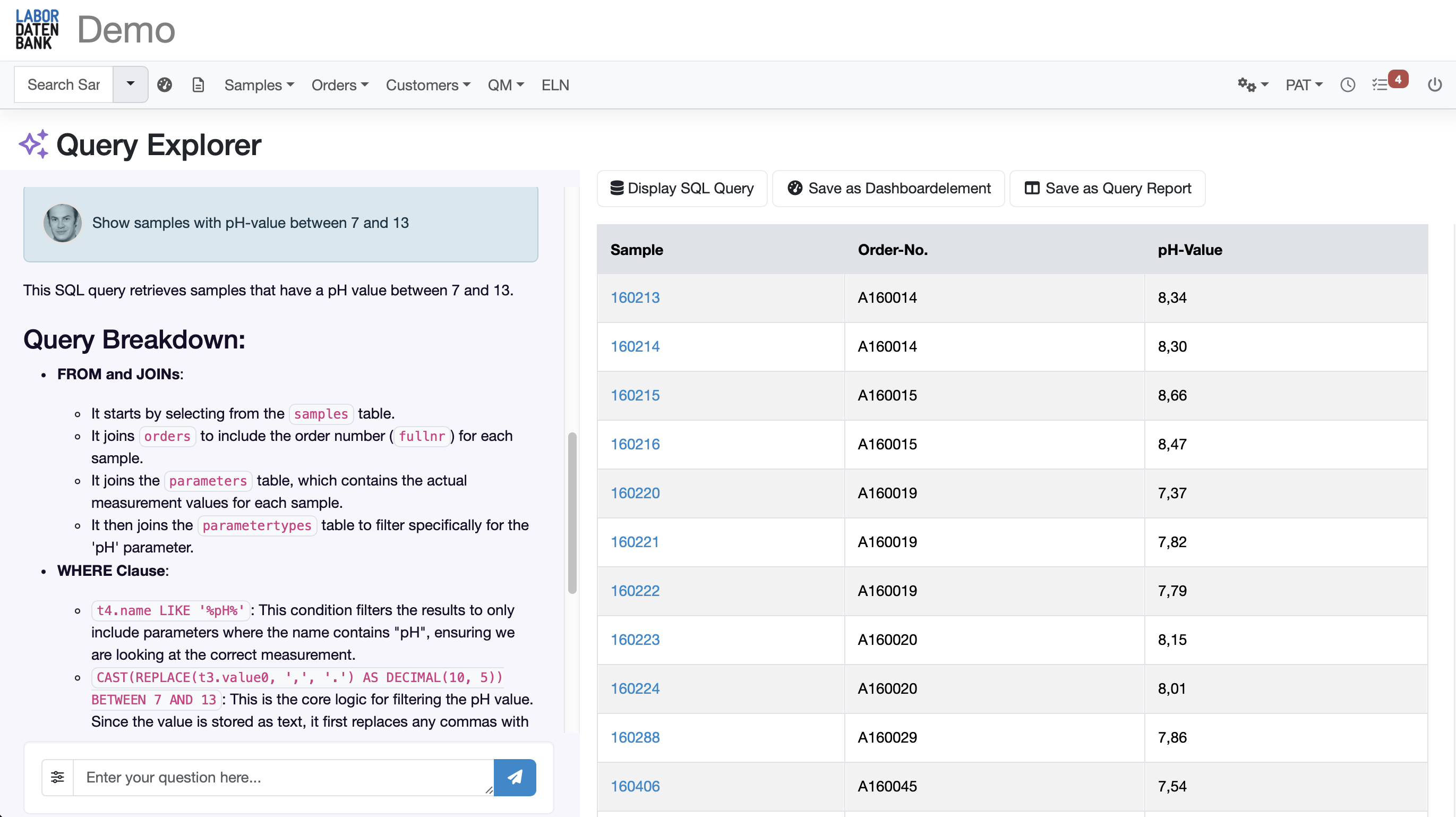 Ask questions in everyday language - ask LDB LIMS directly: "Which samples are overdue?" or "Sales by customer this week?" The Query Explorer sends your question together with the database structure of your LDB LIMS (without the data) to the AI model and returns a database query. The query is executed with a read-only access to the database and the result is displayed as a table.